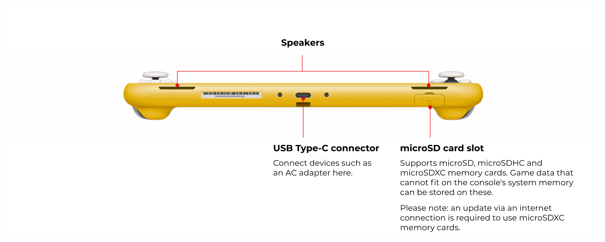 - MicroSD-korttipaikkaYhteensopiva microSD-, microSDHC- ja microSDXC-muistikorttien kanssaHuomio: microSDXC-muistikorttien käyttäminen edellyttää päivitystä internet-yhteyden kautta.